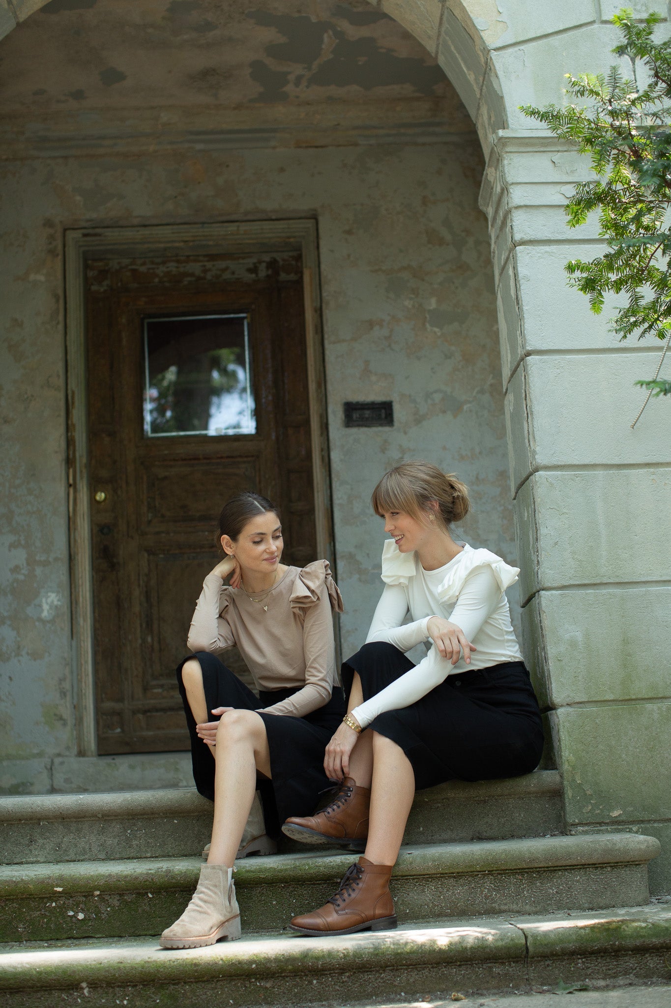 Ruffle Shoulder Long Sleeve Tee- Taupe