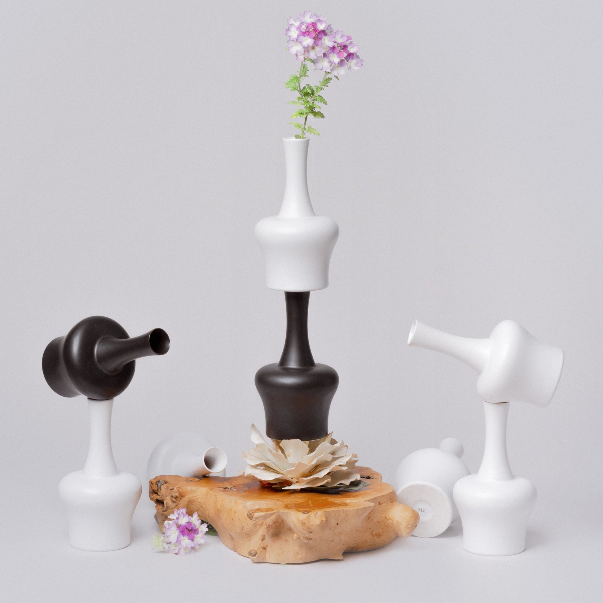 semi-matte glazed porcelain in black or white H x D: 6 in x 3 1/8 in (15.2 cm x 8 cm) Our neutral mini vases dress up, dress down, hold flowers, create sculptural statements, set beautiful tables, make great gifts, and fit in everywhere.