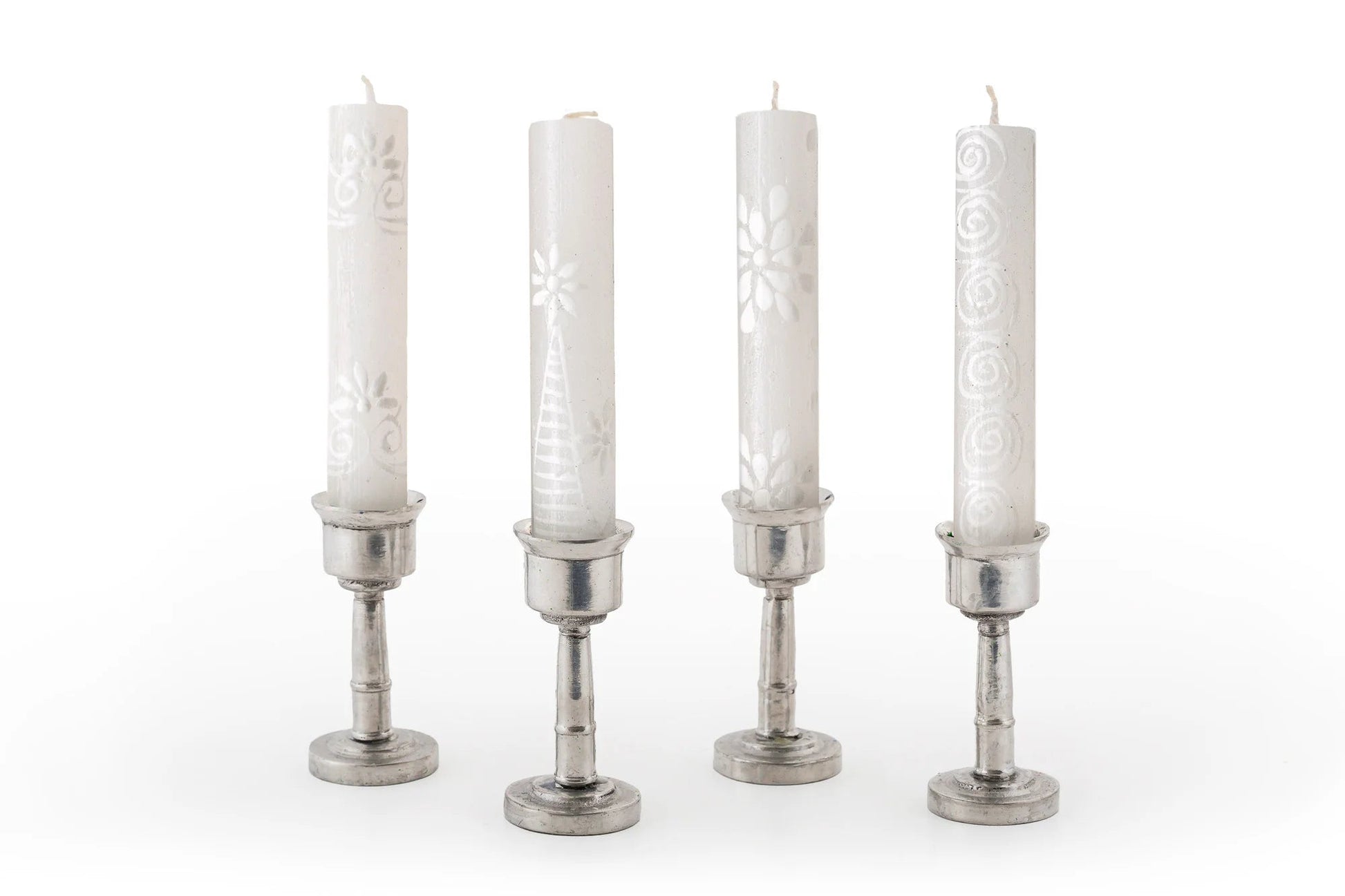 These elegant White on White Shabbat candles are beautiful as they burn! *Lovingly hand poured and hand painted in South Africa. *Crafted primarily by single mothers from the local rural community. *On average, the artisans support an extended family of 12-15 people. PRODUCT DESCRIPTION: * 4.75" taper / 4 hour burn time *Highest quality natural paraffin wax with 100% cotton wick *Unscented, smokeless, and free from added toxins *Shabbat tapers packaged in a 4-pack and tied with a story card. CANDLE CARE: *First burn time: 1-hour for every inch diameter *Wicks should always be cut to ¼” prior to lighting *Avoid drafts – they cause dripping! *Ensure candles are extinguished prior to leaving the room Learn more about the artisan hands that make these fair-trade products!