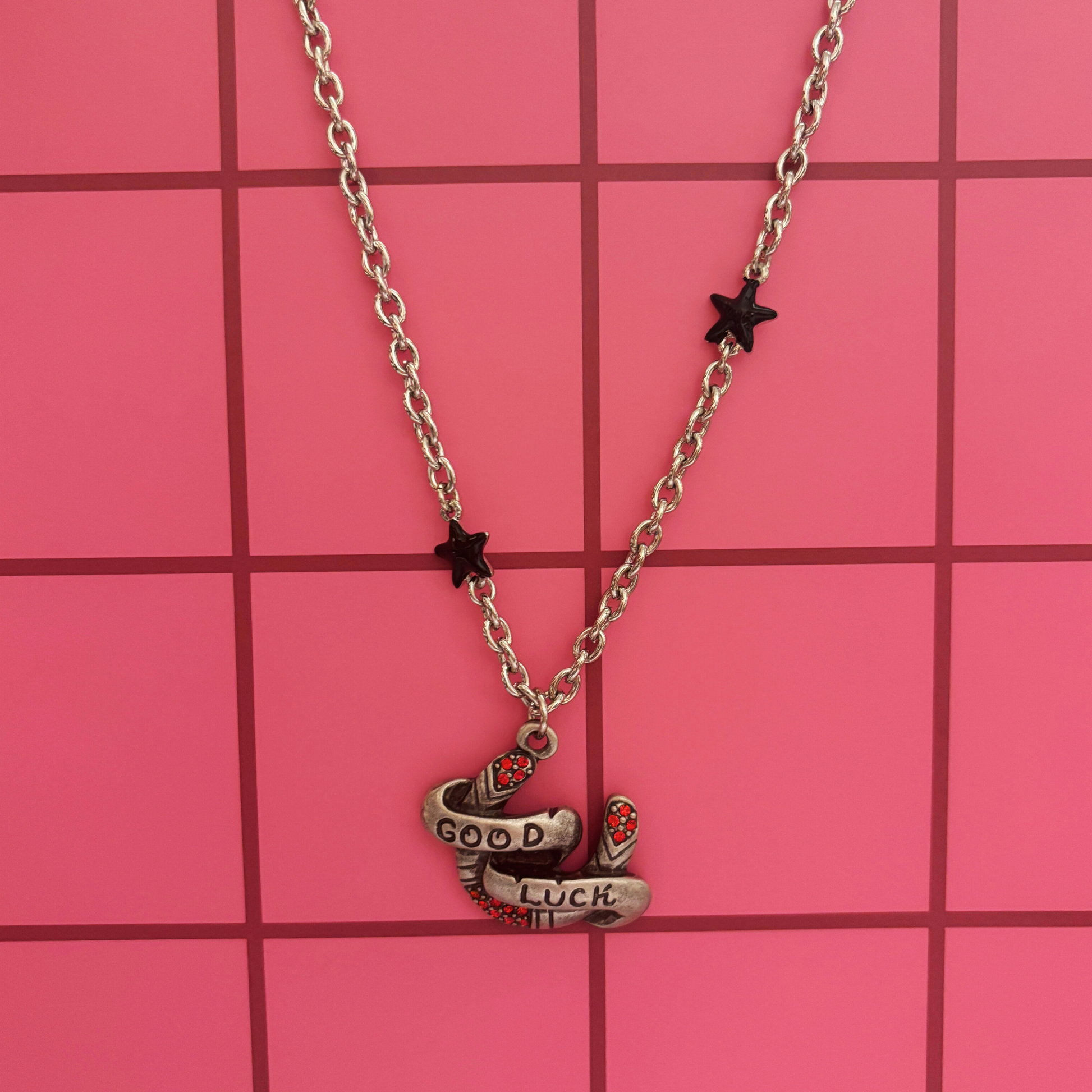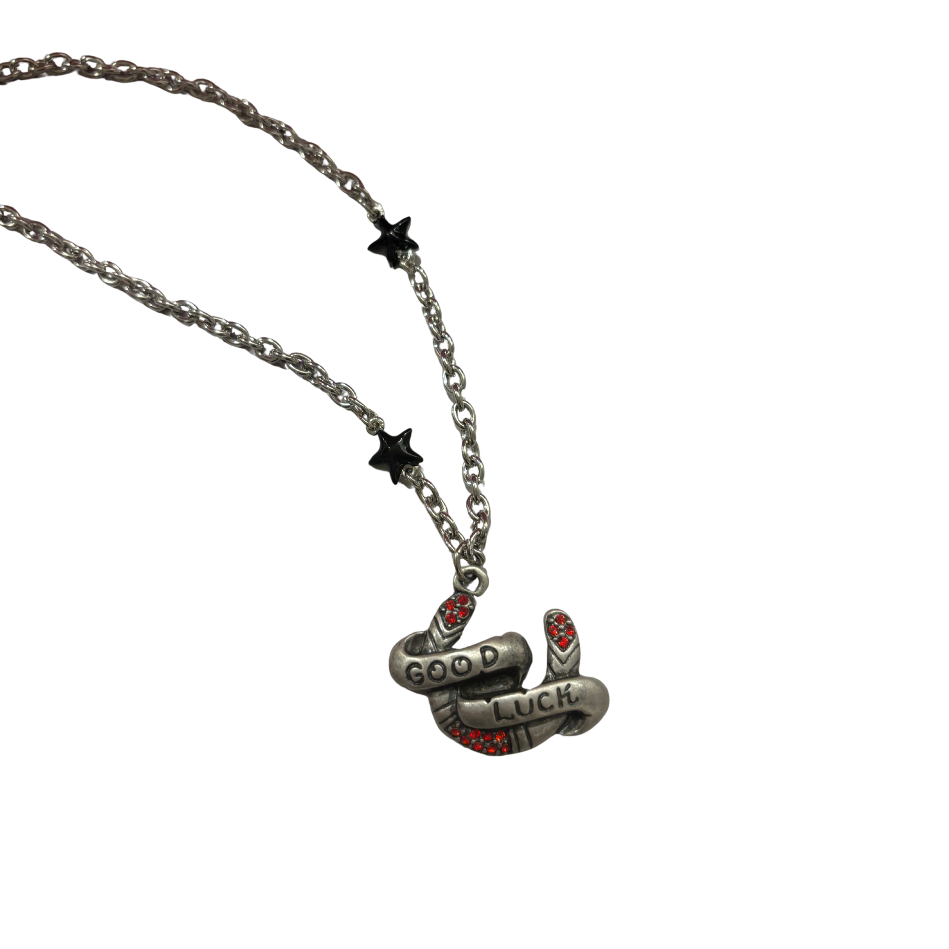 Sourpuss "Good Luck” Horseshoe Necklace with Red Rhinestones & Black Star Charms