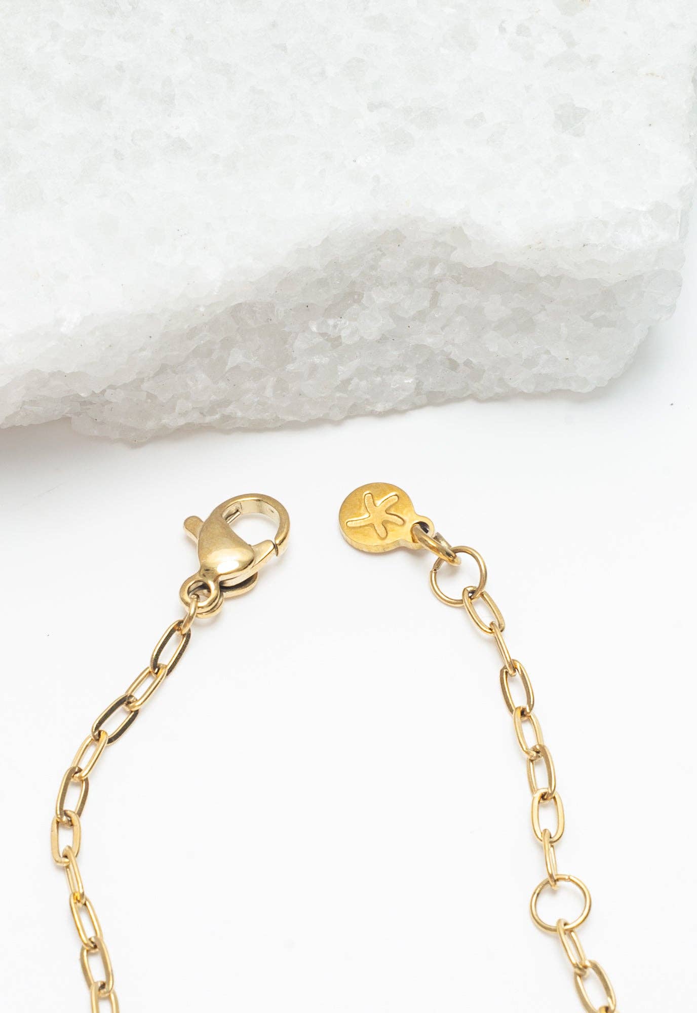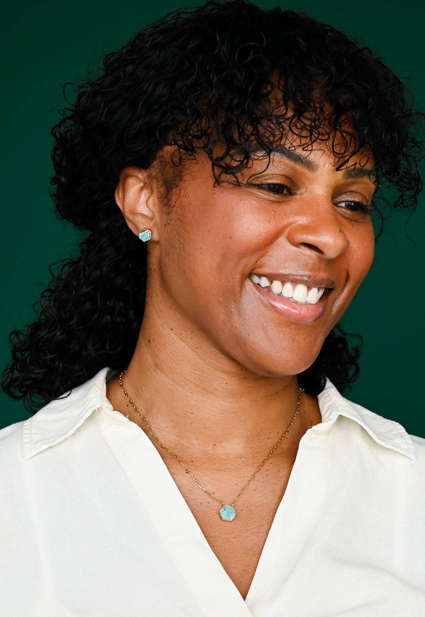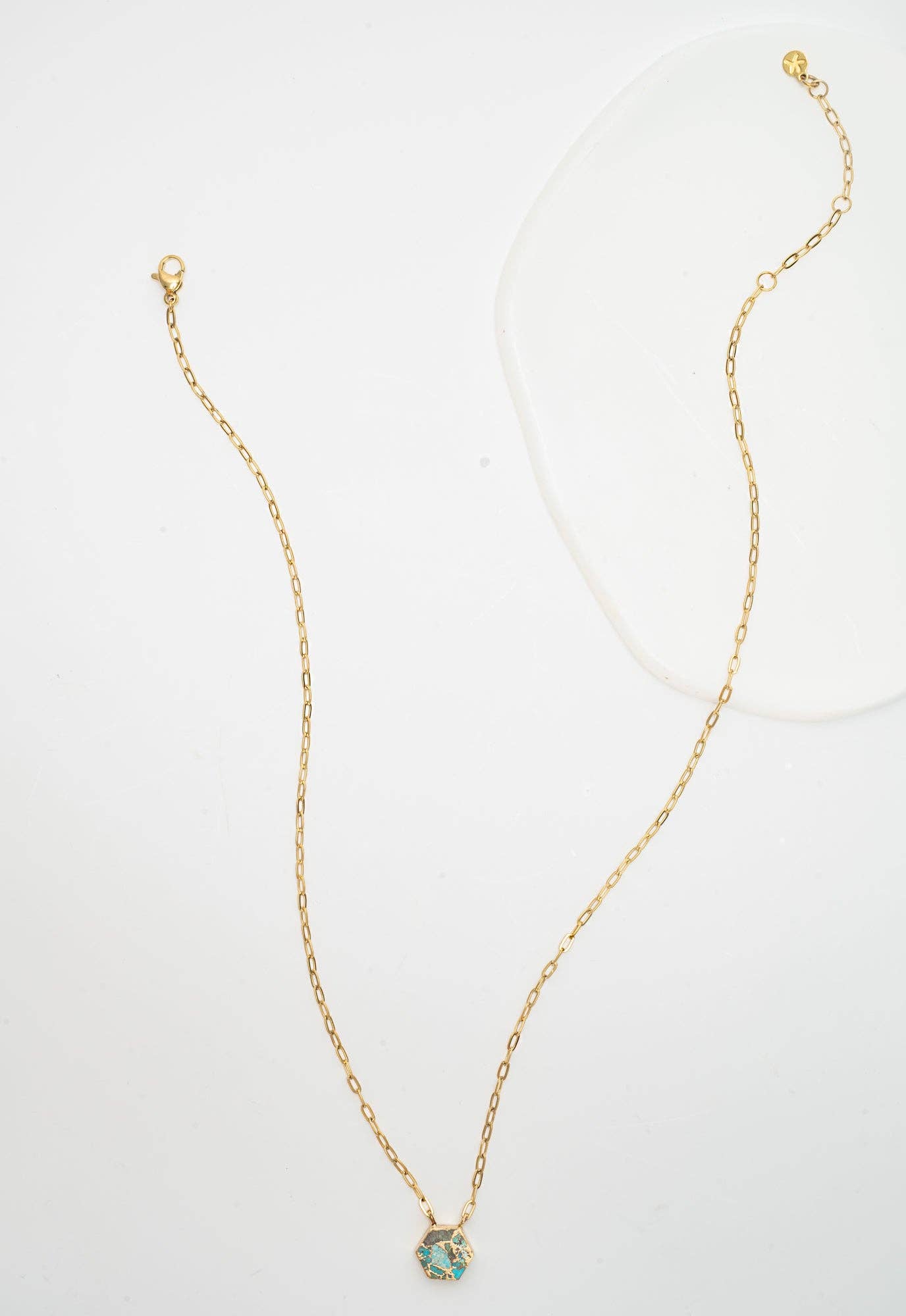 Our Still Waters Necklace invites you to carry peace with you. The natural turquoise hexagon, framed in delicate 14K gold-plated inlay, reflects serenity and strength—like calm waters beneath golden light. The adjustable chain allows for versatile styling, whether layered or worn solo. Each purchase of the Still Waters Necklace helps create safe, dignified work for women experiencing freedom at Starfish Project. You wear hope. She finds her way home. Box size and color may vary. Materials: 14k gold plated stainless steel chain with turquoise necklace Hypoallergenic; lead and cadmium free with nickel content less than 100 ppm. Size: 16-18 inches
