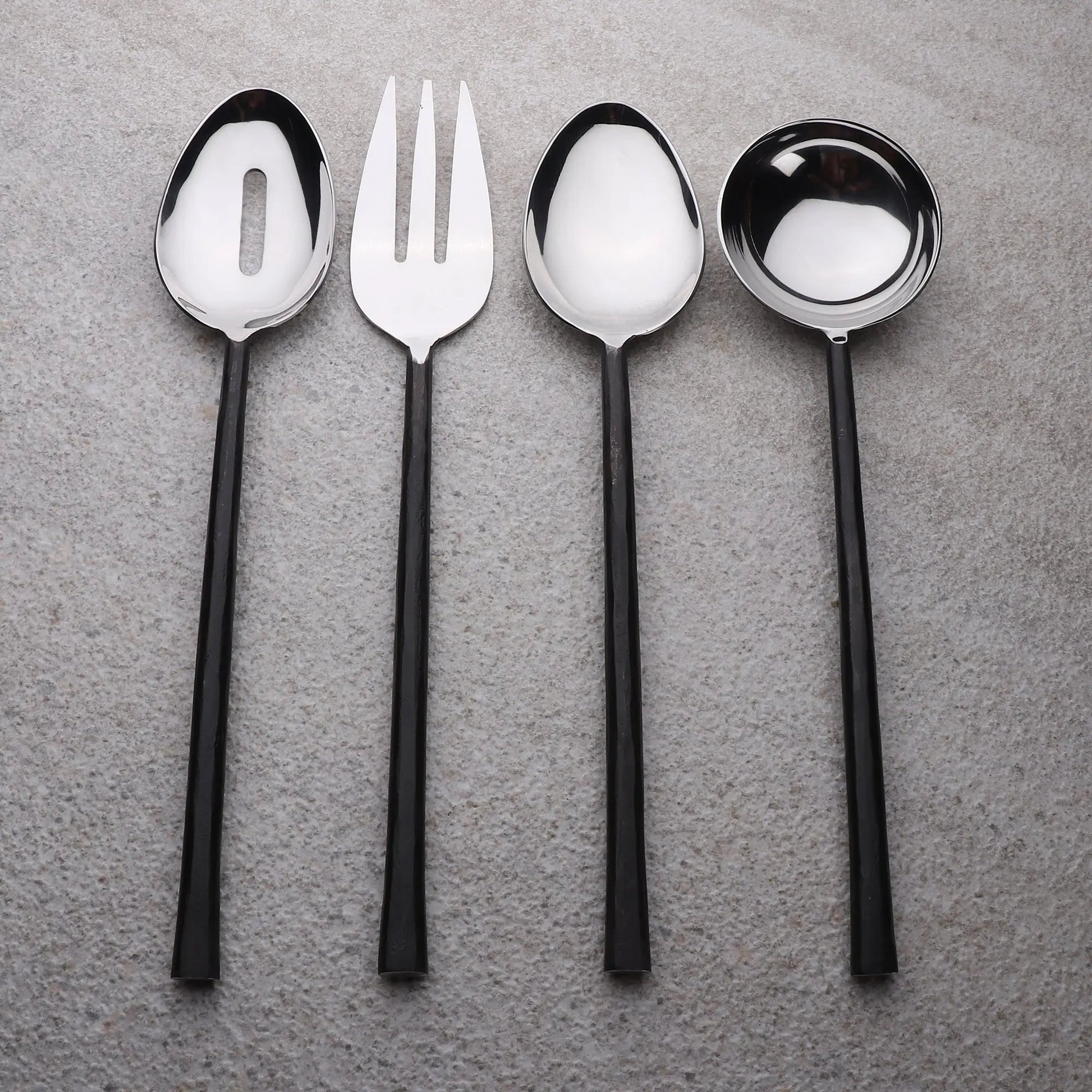 Our Sundance Black 4-Pc. Hostess Set brings rustic elegance to contemporary and classic table settings. It features highly polished stainless steel utensils contrasted with organic textured handles, finished in burnt black. Laid-back and elegant, this unique hostess set is perfect for everyday dining or a gathering of friends.
