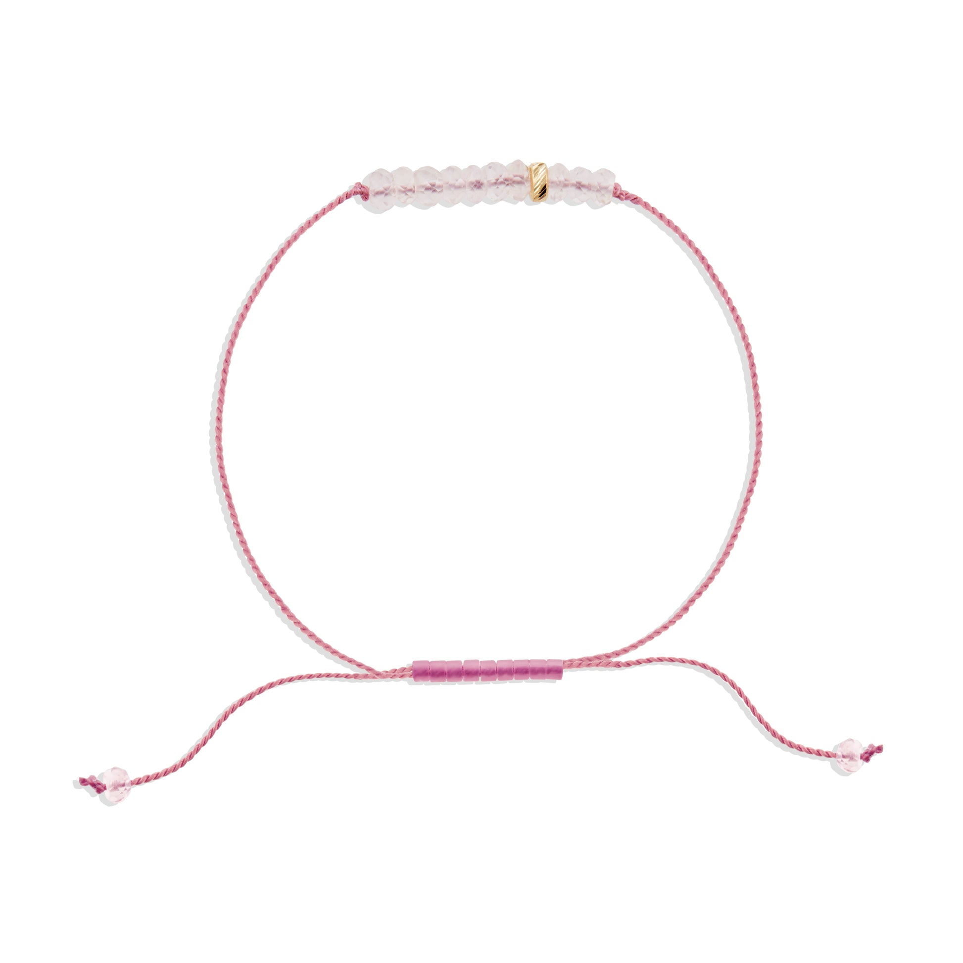 Designed as part of The Energy Project, the Love bracelet is handmade in NYC to open the heart and amplify unconditional love—for self, others, and the world around you. This adjustable bracelet features 10 faceted Rose Quartz beads and a single 14k yellow gold diamond-cut bead, strung on dusty pink nylon cord for a total of 11 beads. In numerology, 11 reflects intuition, enlightenment, and spiritual awareness, while the 8th bead—crafted from solid 14k gold—symbolizes prosperity, connection, and the golden energy of giving and receiving love. Known as the stone of universal love, Rose Quartz encourages compassion and emotional healing, serving as a gentle reminder that love is always present. Finished with an adjustable slide (One Size Fits Most), this piece makes a meaningful gift.
