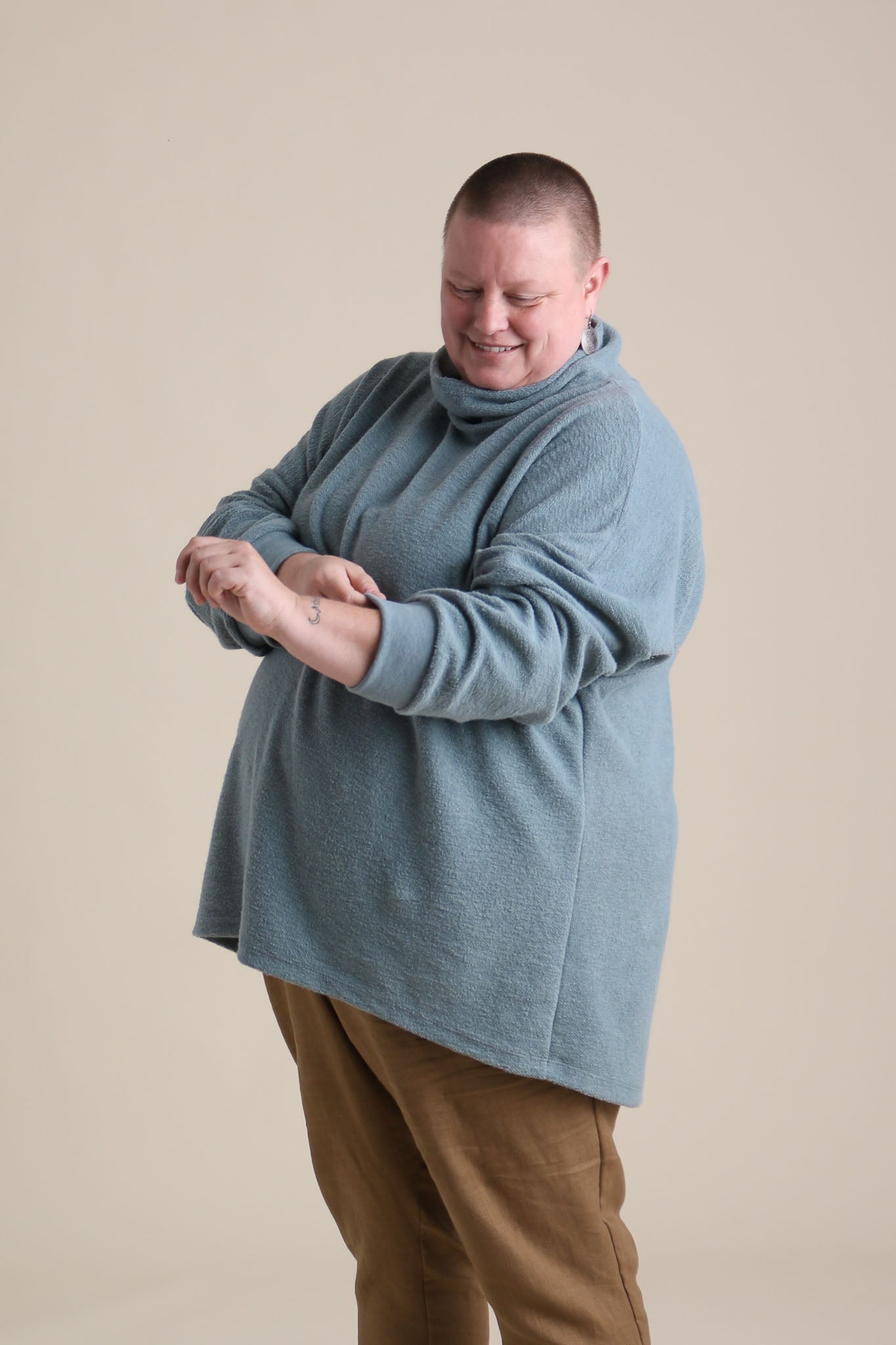 The Traveler Tunic was designed with different bodies in mind. The bottom hem is curved, featuring a longer back panel to keep the torso cozy and completely covered. Sewn with the fuzzy side out, we love how the texture looks and feels. 55/45 hemp and organic cotton knit. Free of polyester, plastic and synthetic fibers.