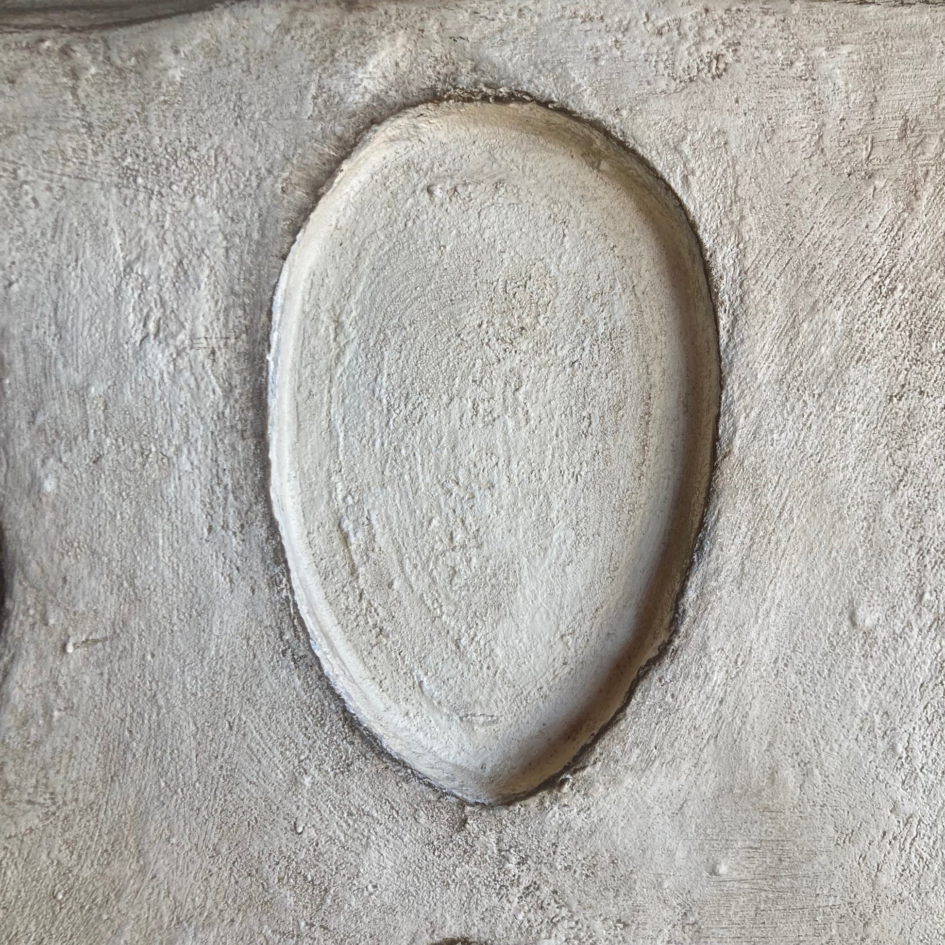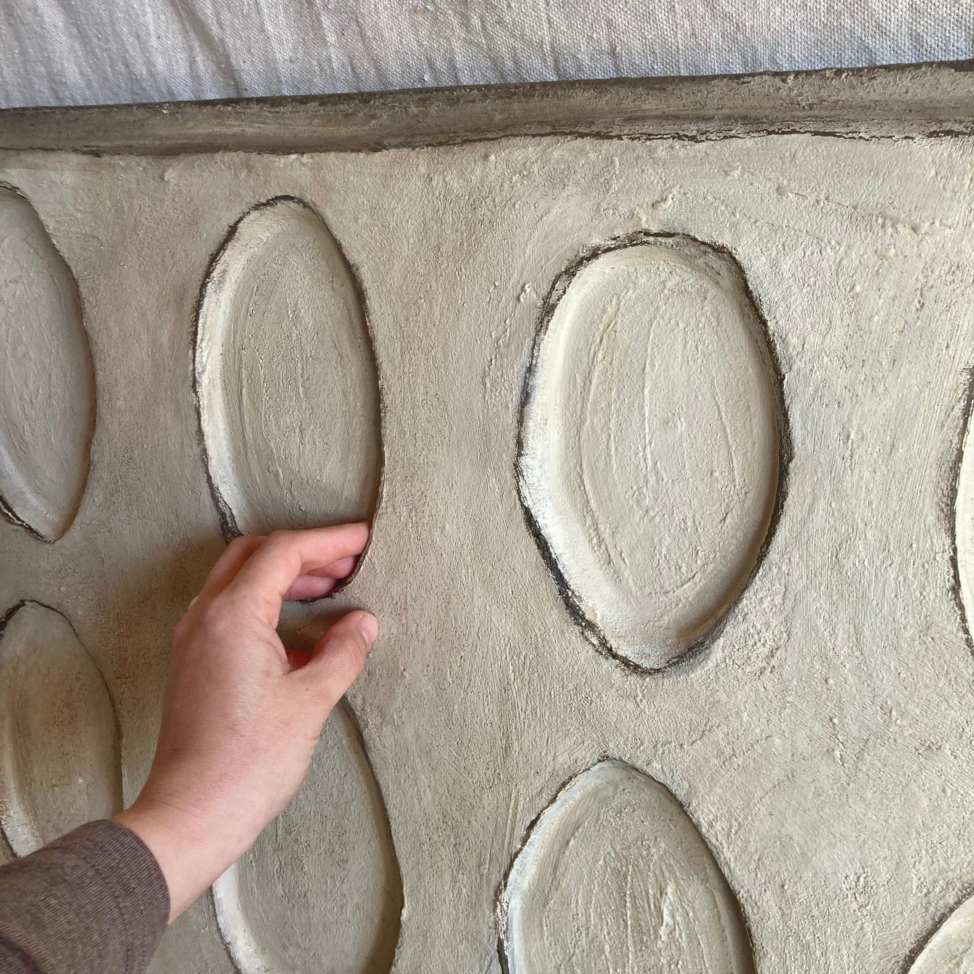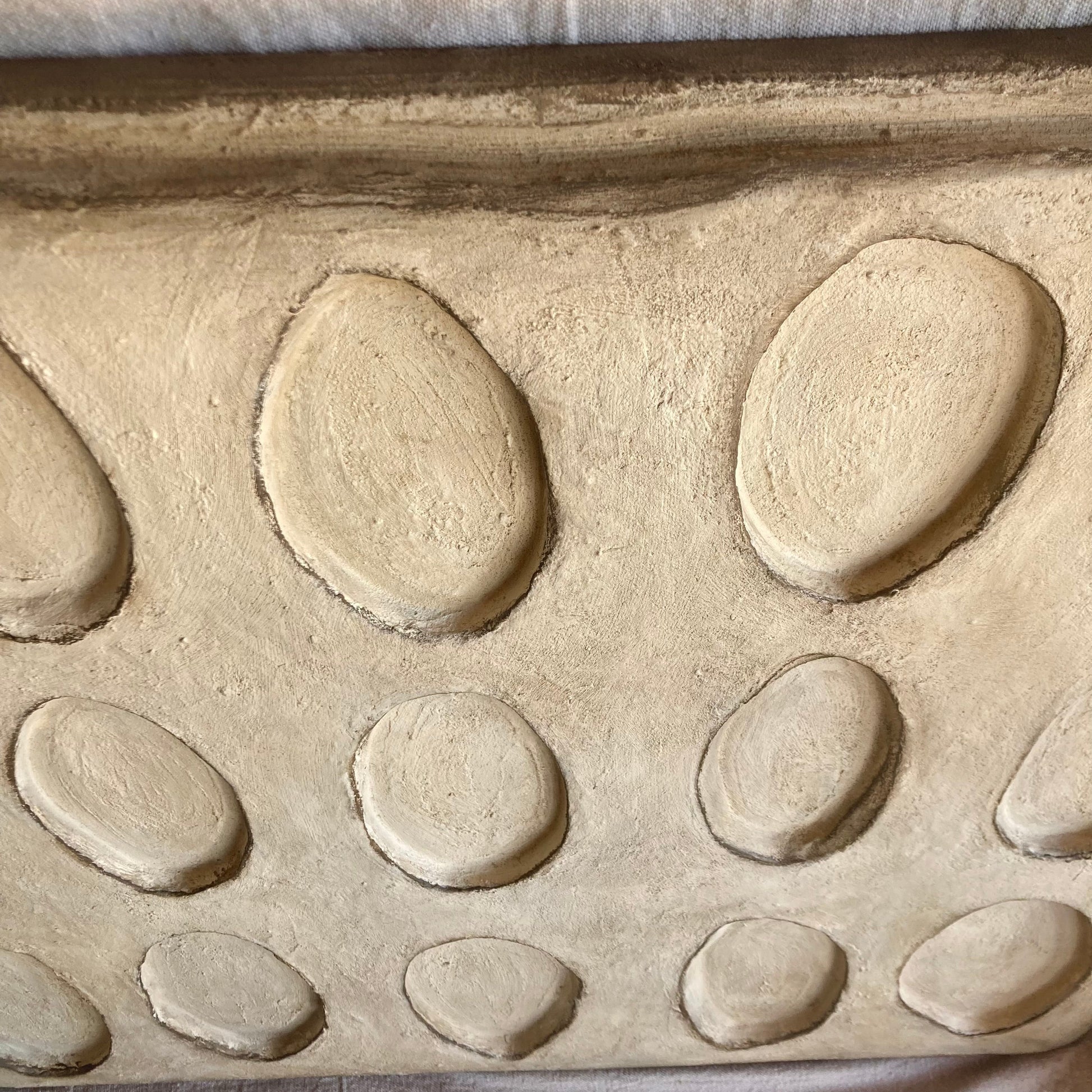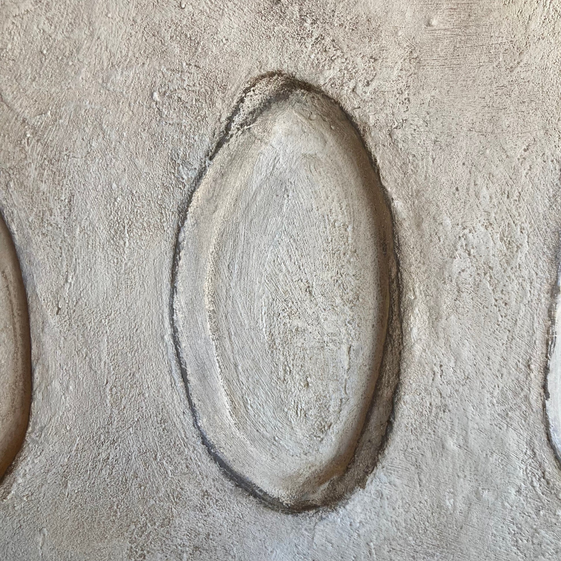 ‘Trodden’ By Greyya Jay Brutalist patina blended with modern simplicity. Primitive style wall sculpture, hand-sculpted and painted in my Minnesota studio. The color palette for this piece is a creamy beige with a tan, greige and brown patina. Each version of this piece will vary slightly due to the hand sculpted/painted nature. 30 inches tall, 40 inches wide, about an inch thick. This piece can be hung vertically or horizontal. Weighs about 18 pounds. This piece will have attached hanging hardware.