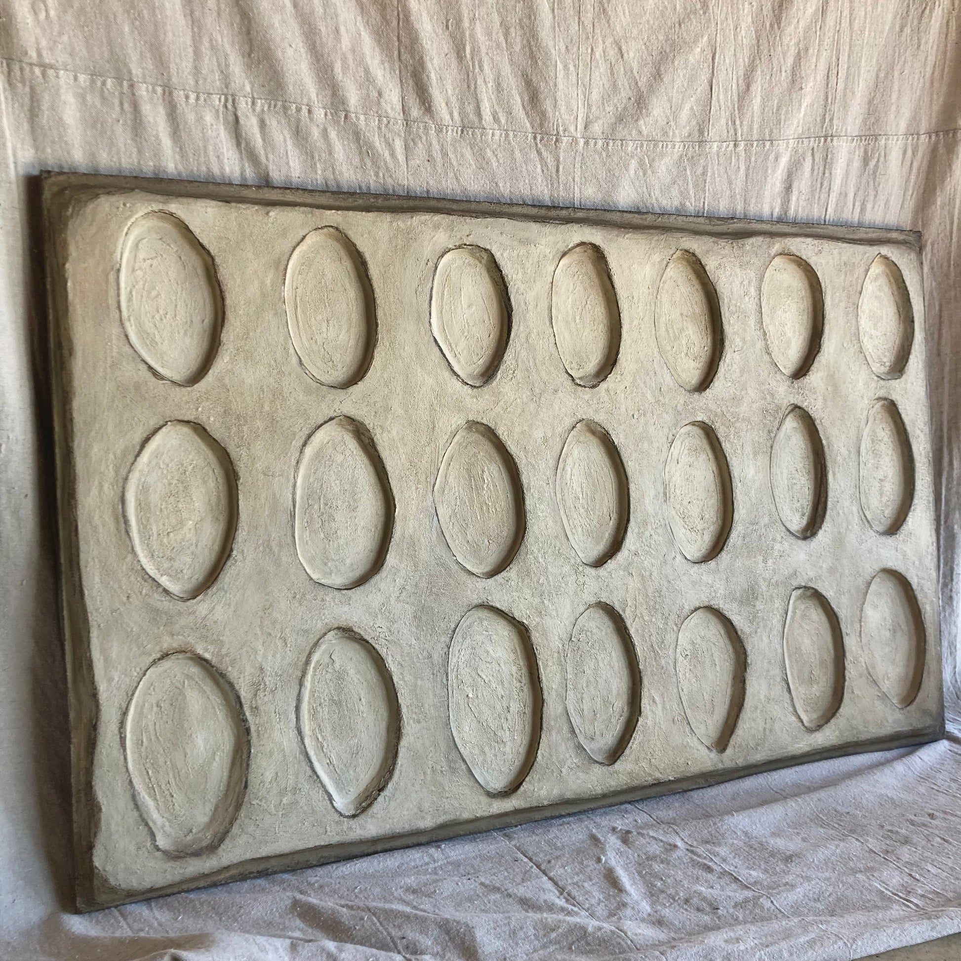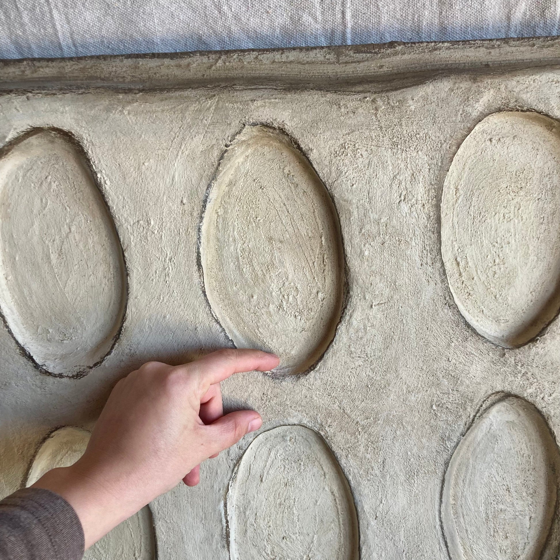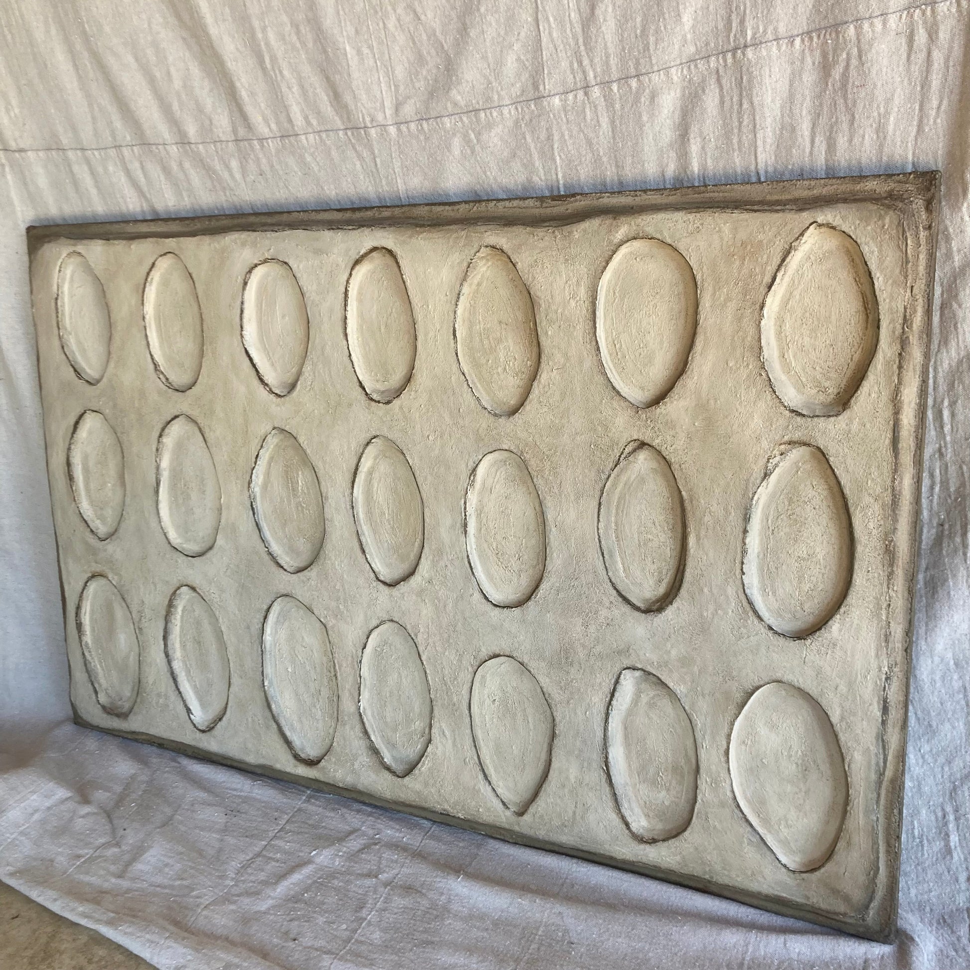 ‘Trodden’ By Greyya Jay Brutalist patina blended with modern simplicity. Primitive style wall sculpture, hand-sculpted and painted in my Minnesota studio. The color palette for this piece is a creamy beige with a tan, greige and brown patina. Each version of this piece will vary slightly due to the hand sculpted/painted nature. 30 inches tall, 40 inches wide, about an inch thick. This piece can be hung vertically or horizontal. Weighs about 18 pounds. This piece will have attached hanging hardware.