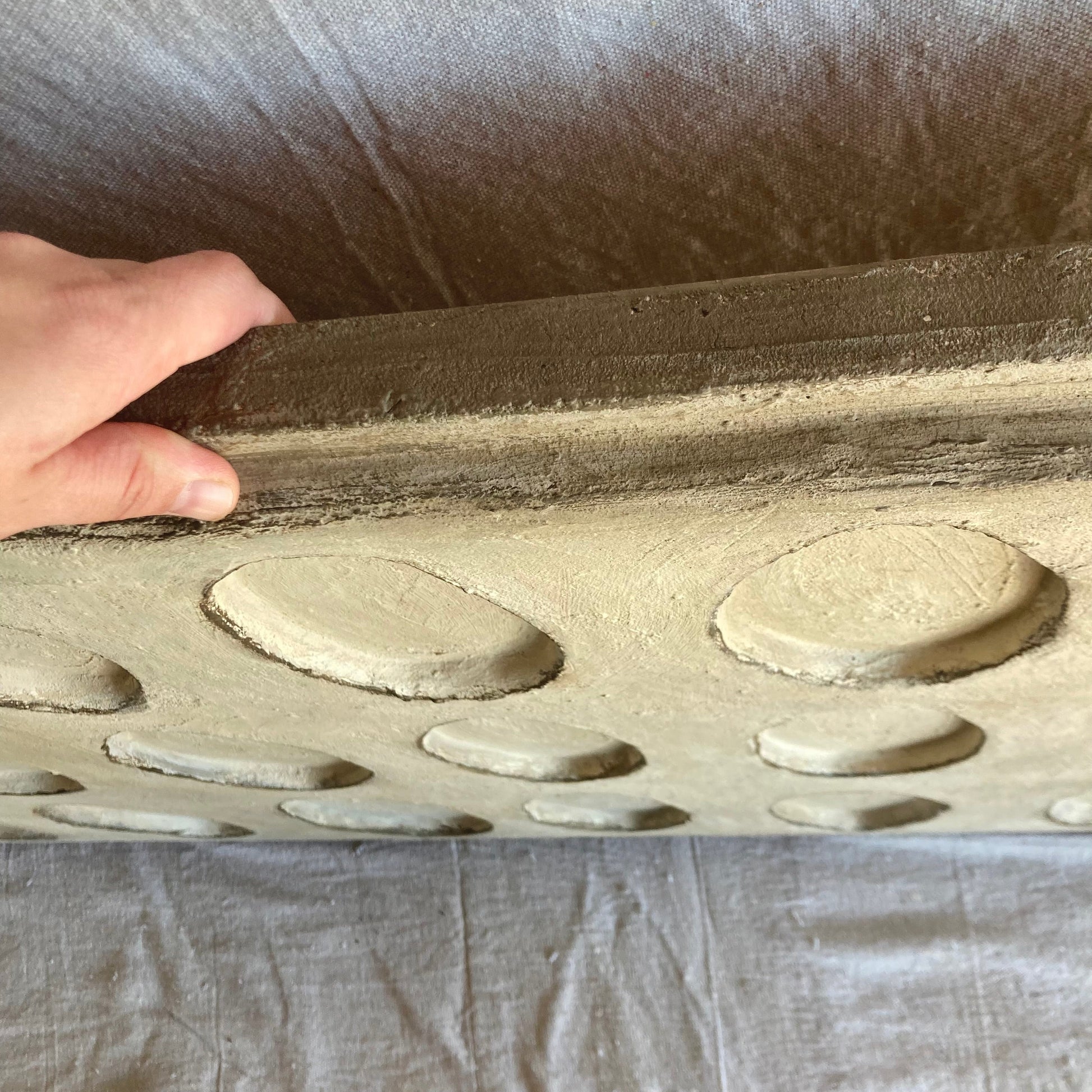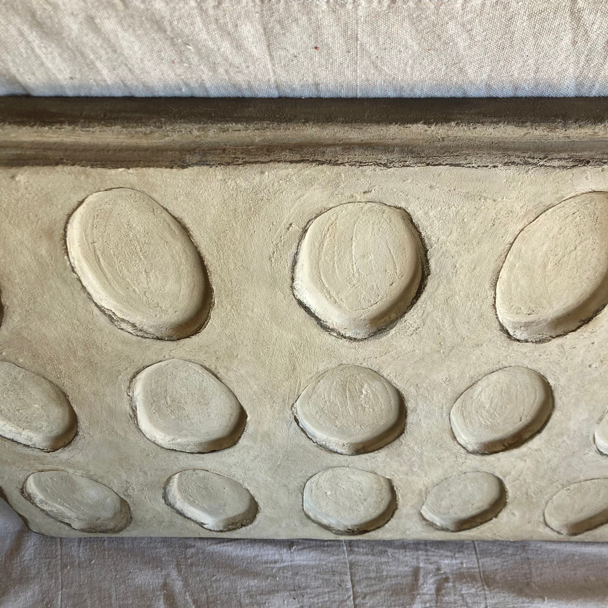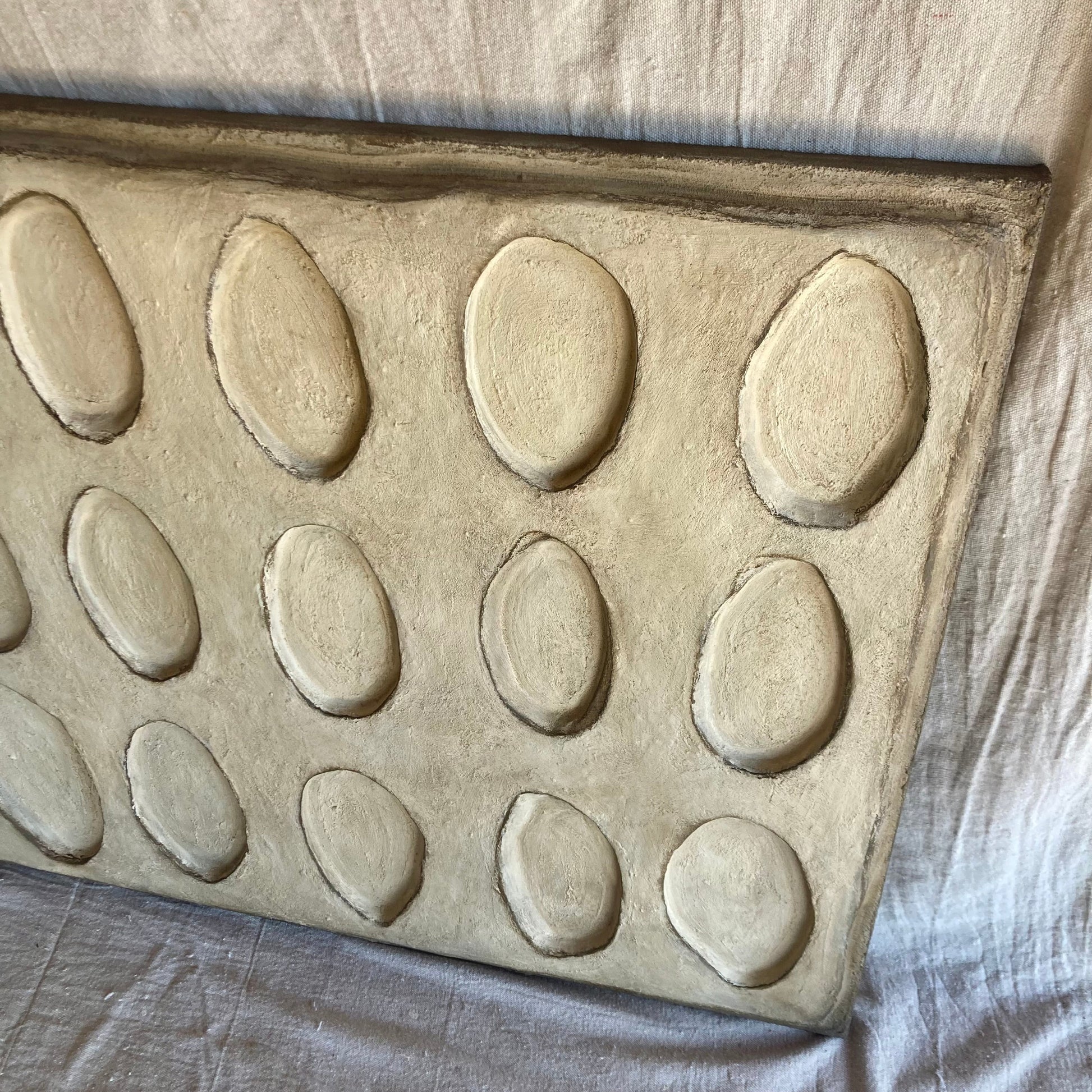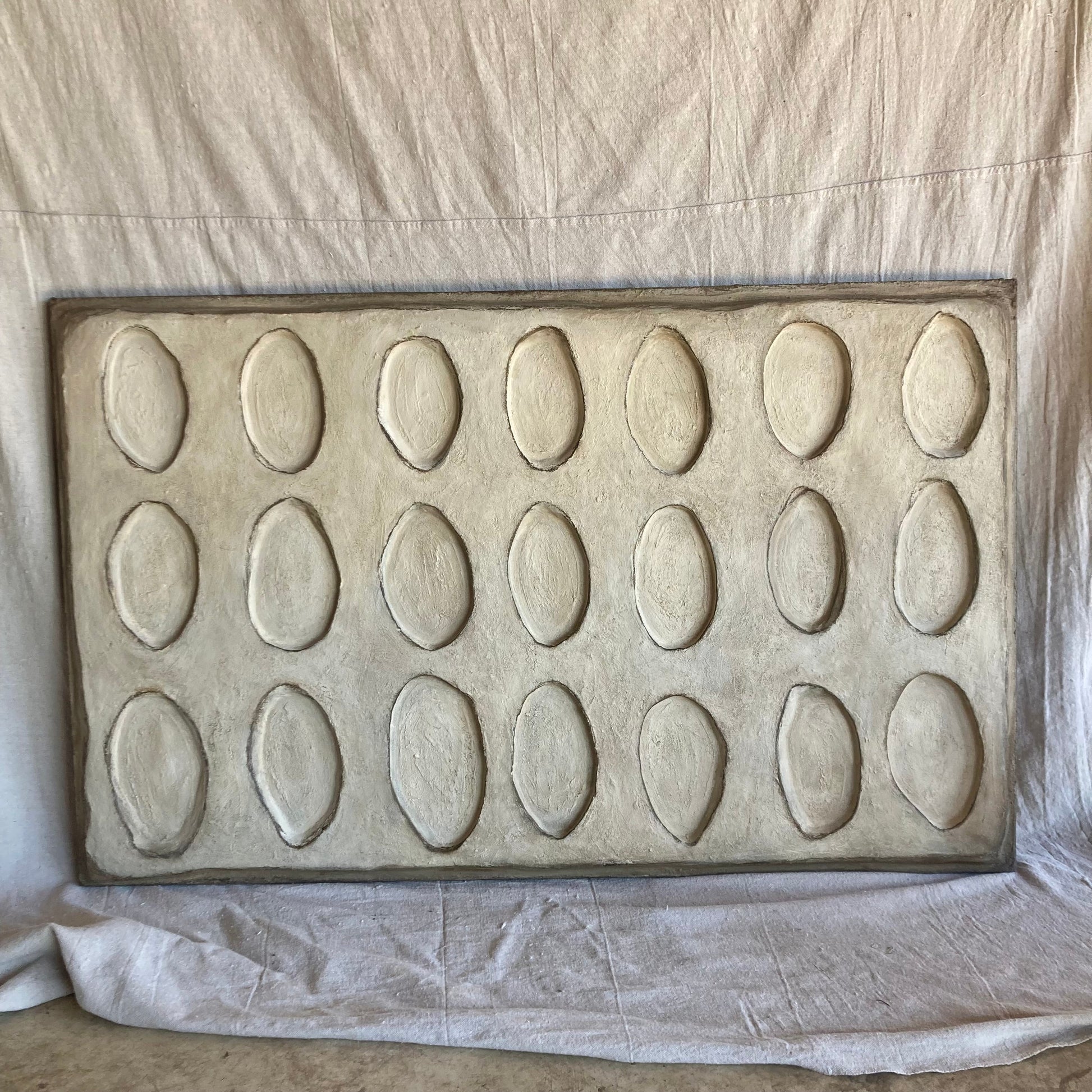 ‘Trodden’ By Greyya Jay Brutalist patina blended with modern simplicity. Primitive style wall sculpture, hand-sculpted and painted in my Minnesota studio. The color palette for this piece is a creamy beige with a tan, greige and brown patina. Each version of this piece will vary slightly due to the hand sculpted/painted nature. 30 inches tall, 40 inches wide, about an inch thick. This piece can be hung vertically or horizontal. Weighs about 18 pounds. This piece will have attached hanging hardware.