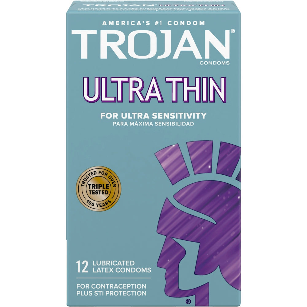 TROJAN Ultra Thin Condoms are over 25 thinner than standard TROJAN condoms giving both partners a more natural sensation. This design allows you and your partner to get closer and experience enhanced intimacy, whenever the mood hits. Plus, our premium lubricant adds comfort and intimacy. They're made from a premium quality latex and are electronically tested to help ensure reliability. These condoms reduce the risk of unintended pregnancy and sexually transmitted infections while you play. For extra safety, there is a special reservoir end. Includes one 12 count box of TROJAN Ultra Thin Condoms. TROJAN Brand condoms are America's 1 condom, trusted for over 100 years. The TROJAN Brand promotes a safe, healthy, and fun sex life. From condoms to vibrators to lubricants, TROJAN Brand is dedicated to delivering innovative, high-quality products that offer pleasure and protection.