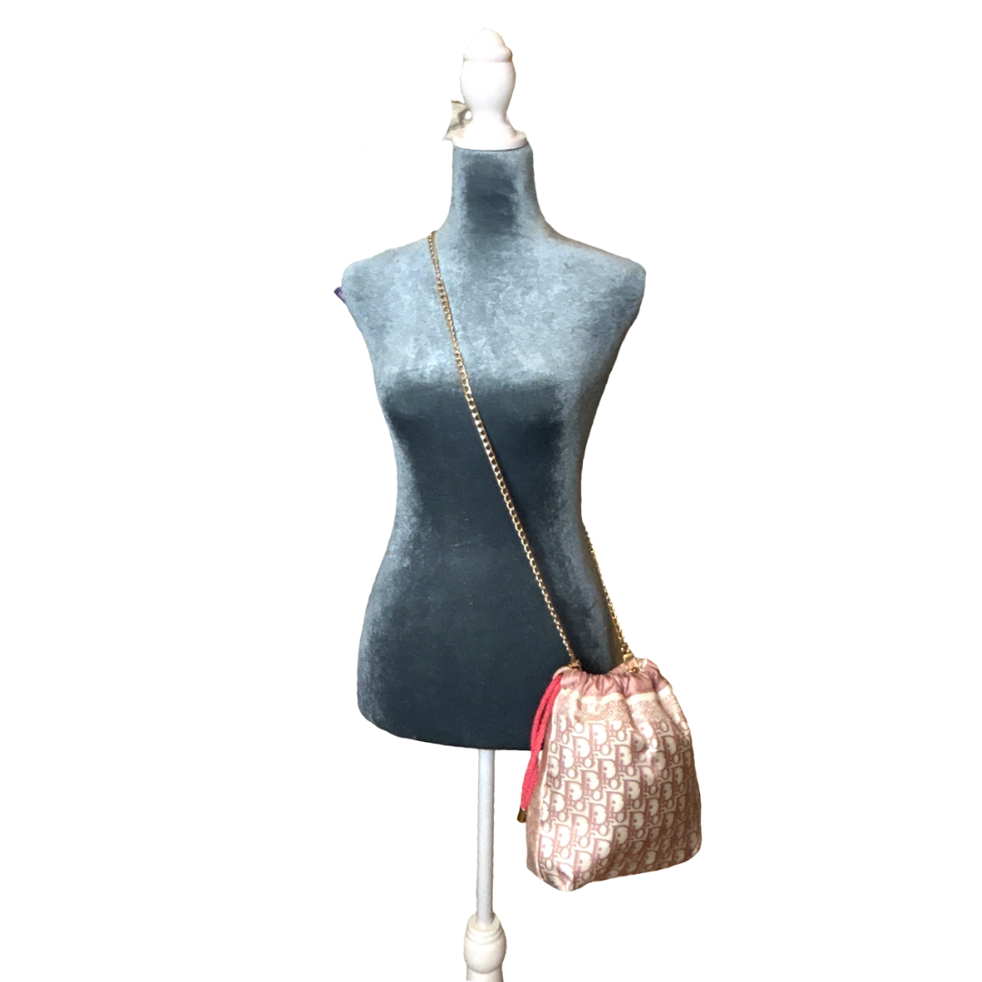 Vintage Dior Trotter Pink scarf front paired with coordinating pink velvet reverse. Fully lined with internal pocket, silken drawstring cord closure and removable 23" drop gold-tone crossbody chain.