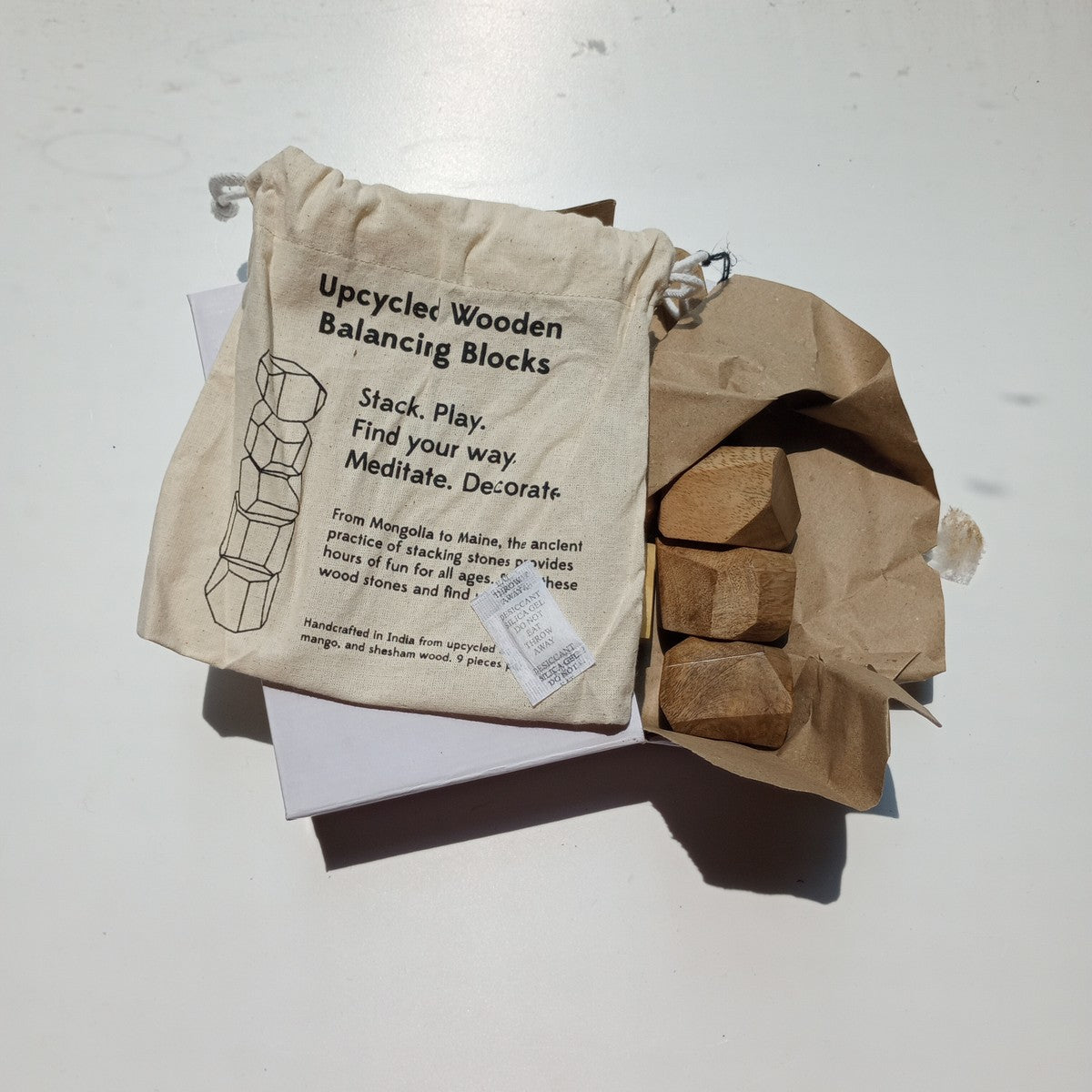 From Mongolia to Maine, the ancient practice of stacking stones provides hours of fun for all ages. Parents, need a little quiet time? This set of nine blocks adds a little extra challenge, translating into a little extra quiet time for you. Need a little movement to get you into a meditative state, this ancient practice is just the thing. Handcrafted from upcycled wood scraps from larger projects, use this sustainably-made set of nine handcarved blocks from papri, mango, and Sheesham woods to Stack. Play. Find your way. Meditate. Decorate. Do it your way, joining this traditional practice of balancing the Upcycled Wood Stacking Stones. These delightful blocks come in a 100% cotton screenprinted drawstring bag for easy storage and to take with you and your kids for quiet playtime on the go.