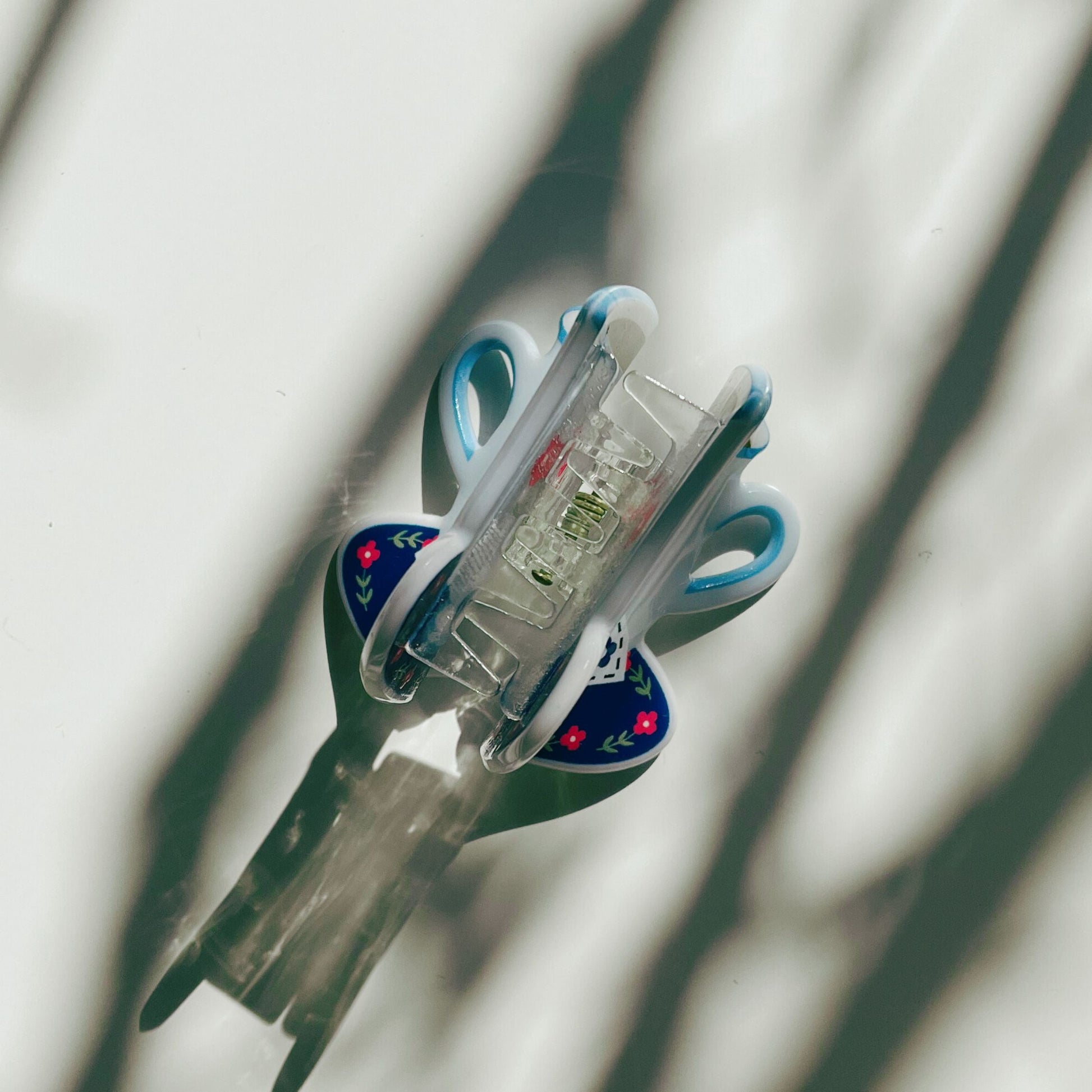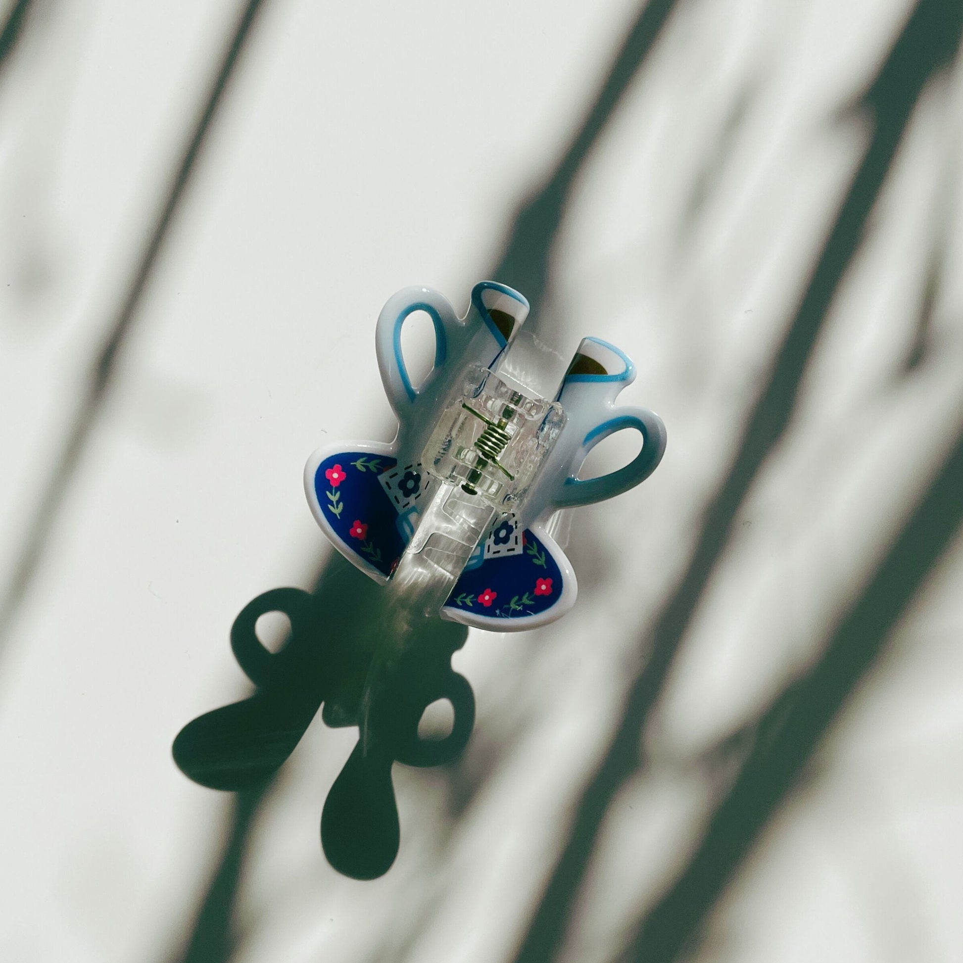 Add a touch of charm to your hair accessories with this Mini Blue Tea Cup Hair Claw, featuring delicate pink flower accents. Compact and eye-catching—ideal for everyday wear or adding a floral flair to your special occasions!