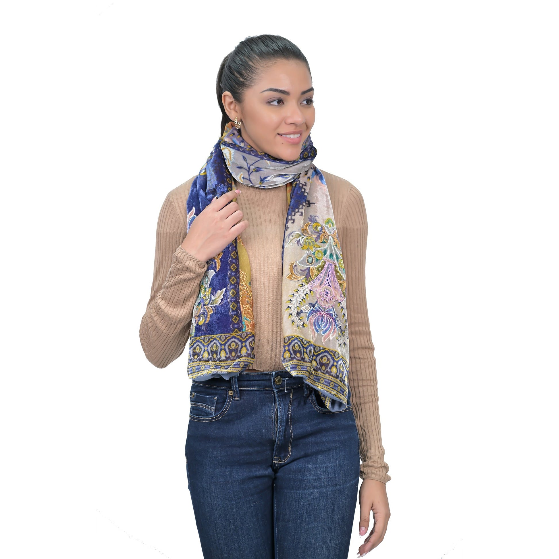 Make a statement with the Vintage Bloom Tapestry Style Scarf, an exquisite accessory designed for elegance and special occasions. Featuring ornate printed floral motifs enhanced with hand-guided machine embroidery, this scarf brings intricate craftsmanship and artistry to every detail. Crafted on plush velvet fabric and patched with cotton-modal blended solid dyed panels, it offers a luxurious feel, soft drape, and comfortable wear. The subtle gradation in dye creates a harmonious blend of colors, adding depth and sophistication to your outfit. Perfect for weddings, festive gatherings, or evening events, this scarf effortlessly elevates any look. Its versatile design allows it to be styled as a shoulder drape, wrap, or neck scarf, making it both fashionable and functional. Key Features: Printed floral motifs with hand-guided embroidery Plush velvet with cotton-modal blended panels Elegant color gradation for a refined look Soft, luxurious drape ideal for special occasions Details:- Grey Embroidered Scarf Size - 20" X 70" 41% Rayon, 9% Nylon, 30% Cotton, 20% Modal CARE: Hand wash cold, do not bleach, dry flat, low iron or dry clean Designed in Los Angeles Made in India