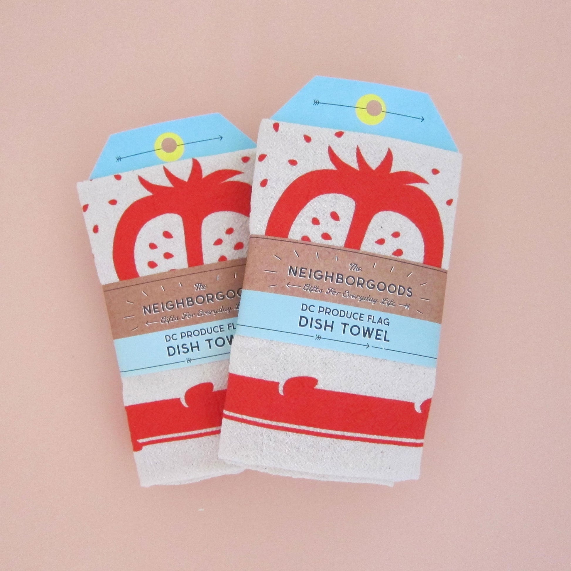 Show off your love and pride for the nation's capital with our fun take of the Washington DC Flag. Our DC Flag Produce dish towel is hand screen-printed and made from 100% flour sack cotton, which means it will only get softer and more absorbent over the years in your kitchen. A perfect gift for a tourist or hometown native, this dish towel is a symbol of your love and pride for the District. 100% unbleached cotton Hand screen-printed with eco-friendly water based inks Machine washable Packaged in a ready-to-gift belly band Printed in the USA, hand packaged and designed in DC 24”W, 26”L Color may vary from monitor to monitor