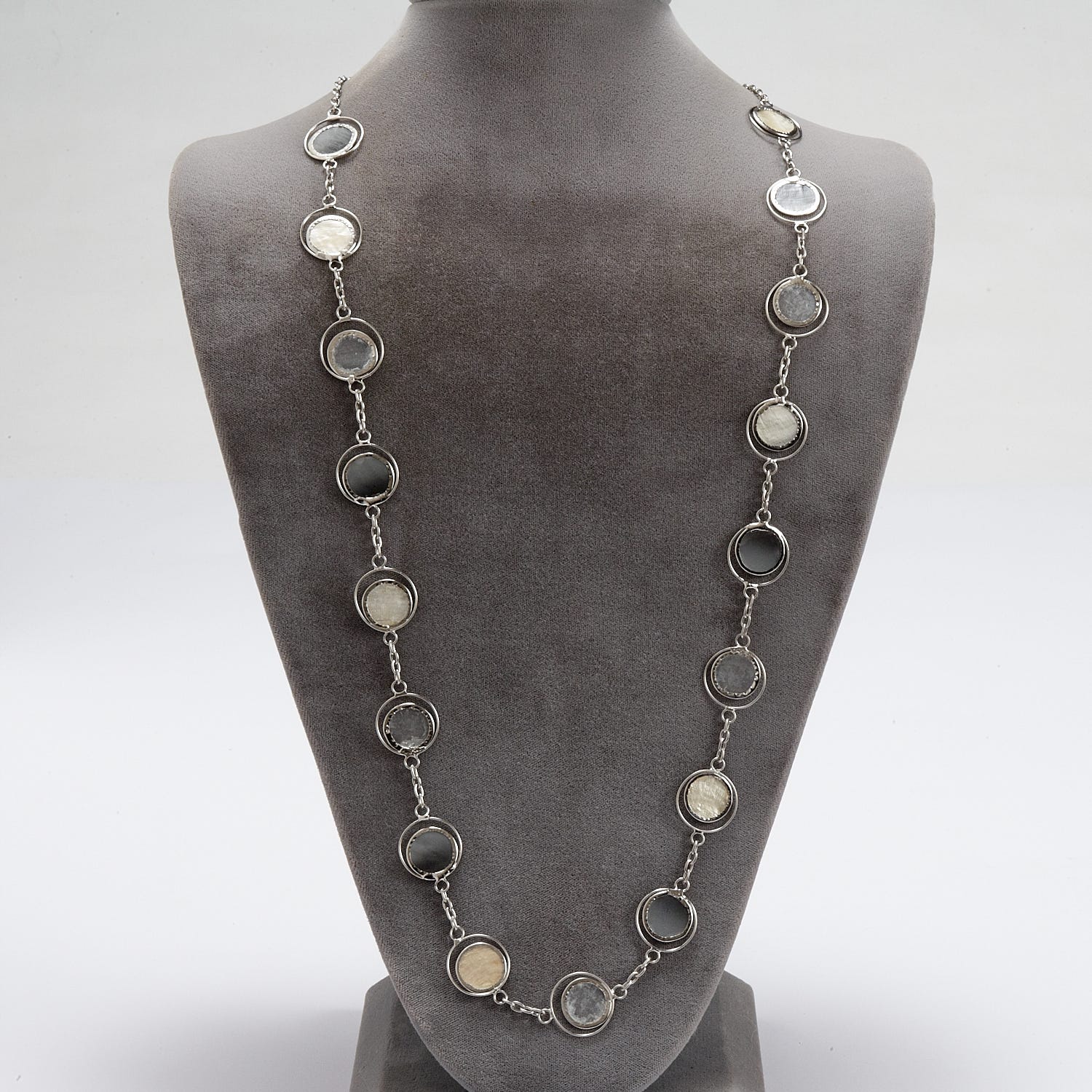 Delicate in pearly white, this stunning necklace is made from capiz, the thin shell of a marine mollusk. First artisans wash and soak shells. After the shells have dried, they are cut into shapes and edged with metal wire. A finishing coat of varnish completes this labor-intensive process. Before glass windows became available in the Philippines, capiz was used for windows in houses.