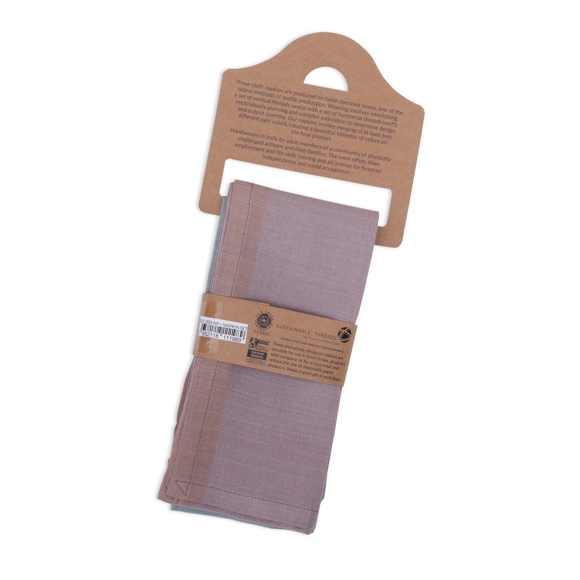Threads of Tradition, Woven in Two Tones. Every table deserves a touch of story. Our two-tone handwoven cotton napkins are crafted by indigenous women artisans from Eastern India on bamboo looms. Each napkin combines two colors in intricate patterns, making every piece truly one-of-a-kind. Soft, absorbent, and durable, they bring elegance and sustainability to everyday meals or special occasions. By choosing these napkins, you’re supporting skilled women weavers, preserving a centuries-old craft, and embracing an eco-conscious alternative to disposable paper napkins. Set of four, Fair Trade, and made with low-impact dyes — perfect for gifting, entertaining, or adding a meaningful touch to your home. FEATURES Size: 16"x16" — Perfect for everyday dining, entertaining, or gifting Material: 100% cotton — Soft, durable, and eco-friendly Design: Two-tone patterns woven from warp and weft threads Technique: Handwoven on bamboo looms with low-impact dyes Care: Machine wash cold, delicate cycle; tumble dry low Ethical: Fair Trade product supporting indigenous women artisans Set of 4: Ideal for gifting or party favors Disclaimer: Slight variations in color or pattern may occur due to the handmade nature of these napkins and differences in device screens. These variations are a hallmark of authentic artisan craftsmanship.