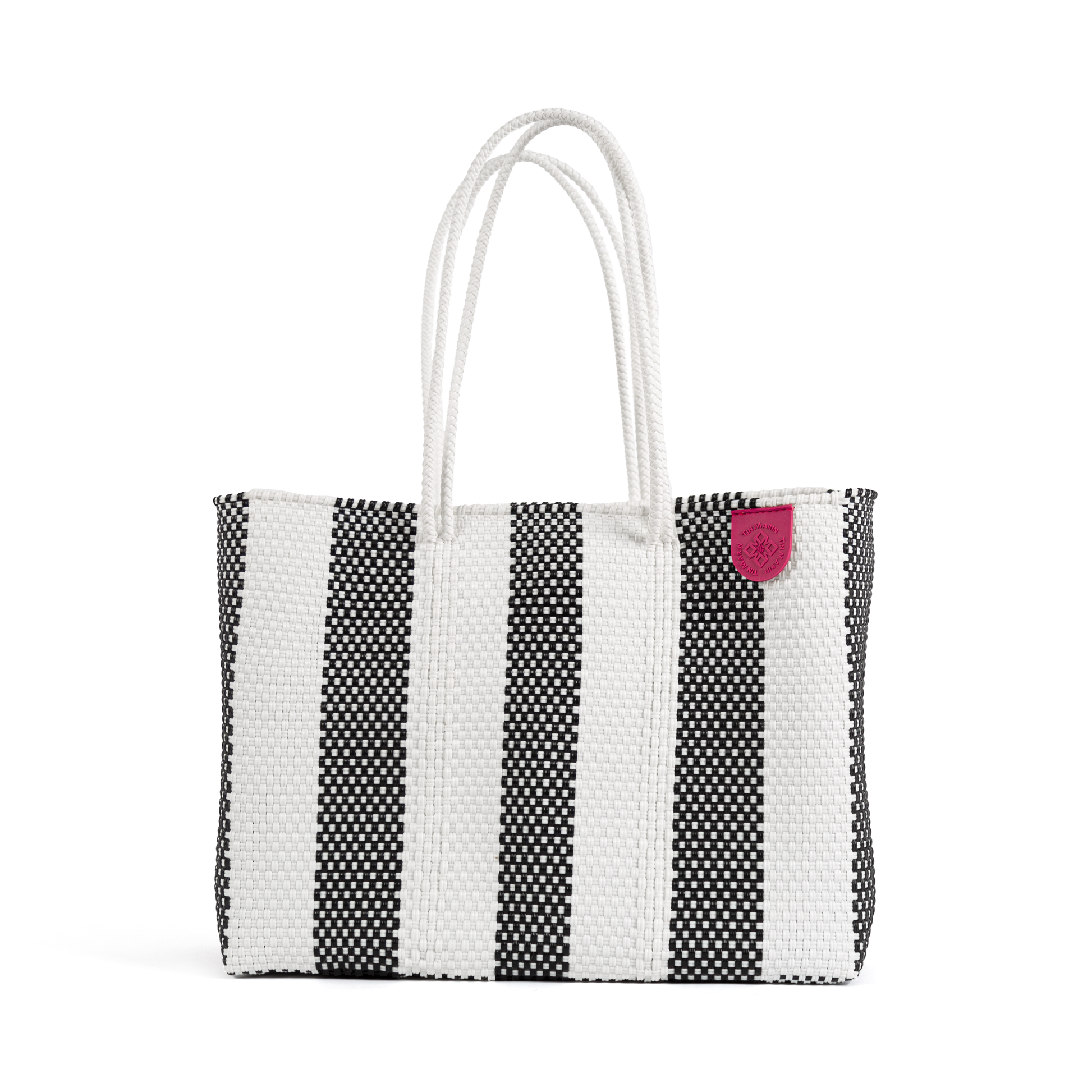 Say hello to your new go-to bag for sunny adventures! The Woven Super Totes are designed to carry all your beach-day must-haves with ease and style. Handmade by artisans in Mexico, this water-resistant and flexible tote combines functionality and charm for every occasion. Features: Eco-Friendly Craftsmanship: Made with 100% recycled plastic, supporting sustainability and artisanal traditions. Spacious Interior: Perfect for packing towels, books, sunglasses, snacks, and plenty of sunscreen—your ideal beach or travel companion. Water-Resistant & Durable: Flexible material ensures long-lasting use for all your adventures. Lightweight and easy to carry wherever you go. Versatile Style: Great for beach vacations, picnics, farmer's markets, gym, and beyond. Customization Options: Enhance its functionality with a Checs Nylon Pouch (special bundle price) or personalize it with playful Pompoms. Bonus: Includes a FREE Pompom while supplies last (colors and sizes may vary). Every bag takes 20-40 hours to create by our skilled artisans, supporting over 200 artisans while celebrating the beauty of sustainable craftsmanship & unique, one-of-a-kind designs. The Zebra design is also available in Medium Crossbody. Take a look at our complete Size Chart with the dimensions of every bag to make sure you're getting the bag that's perfect for you.
